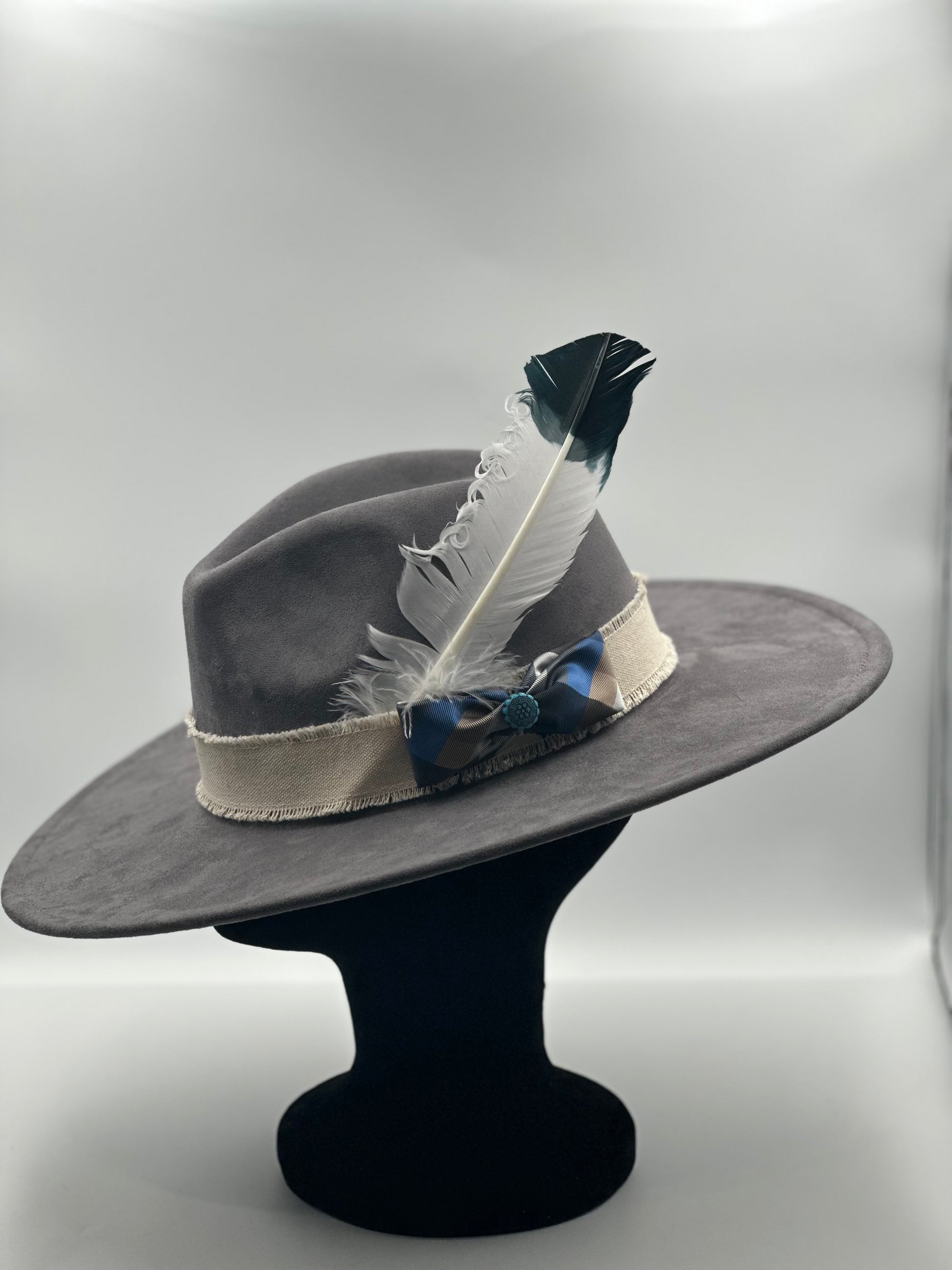 Feather Detail: Long black and white plume feather, paired with shorter accent feathers for depth