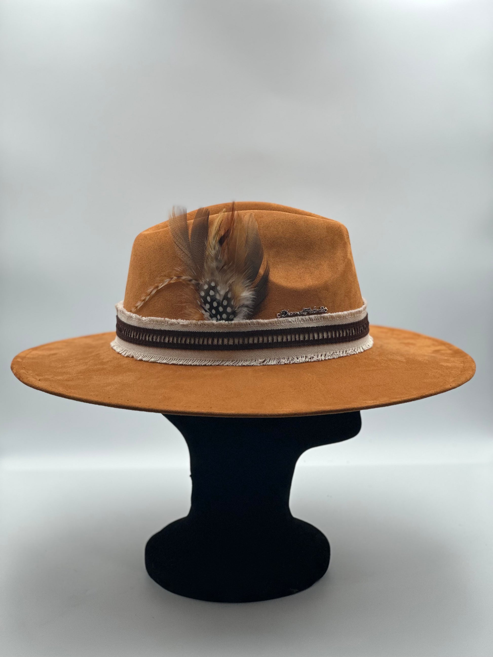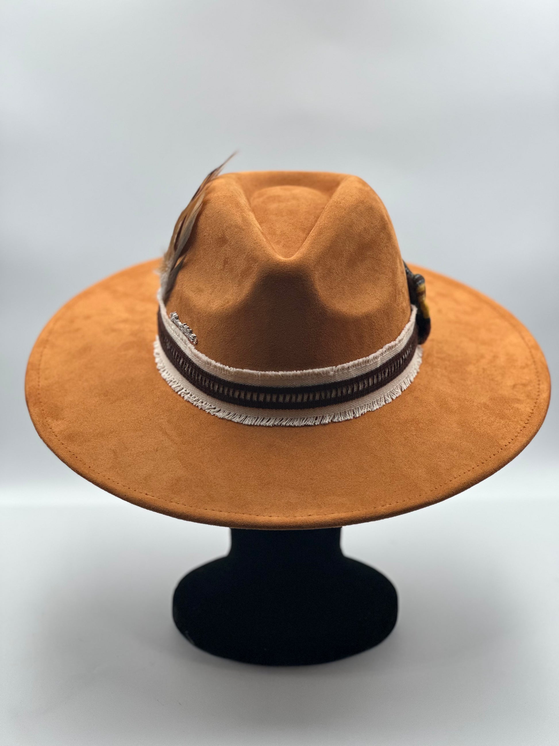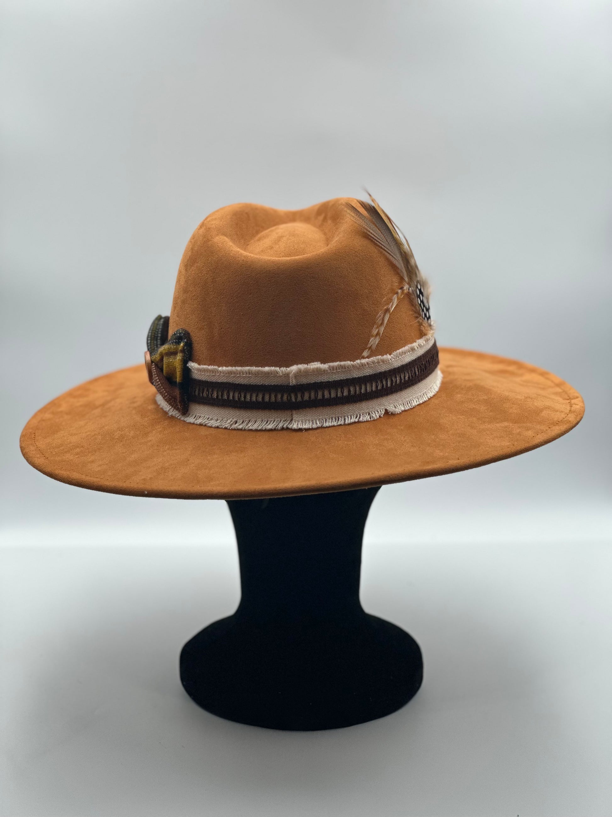 Band: Dual-layer trim with earth-toned fabric and woven accents, bordered by frayed linen edgework for rugged elegance.