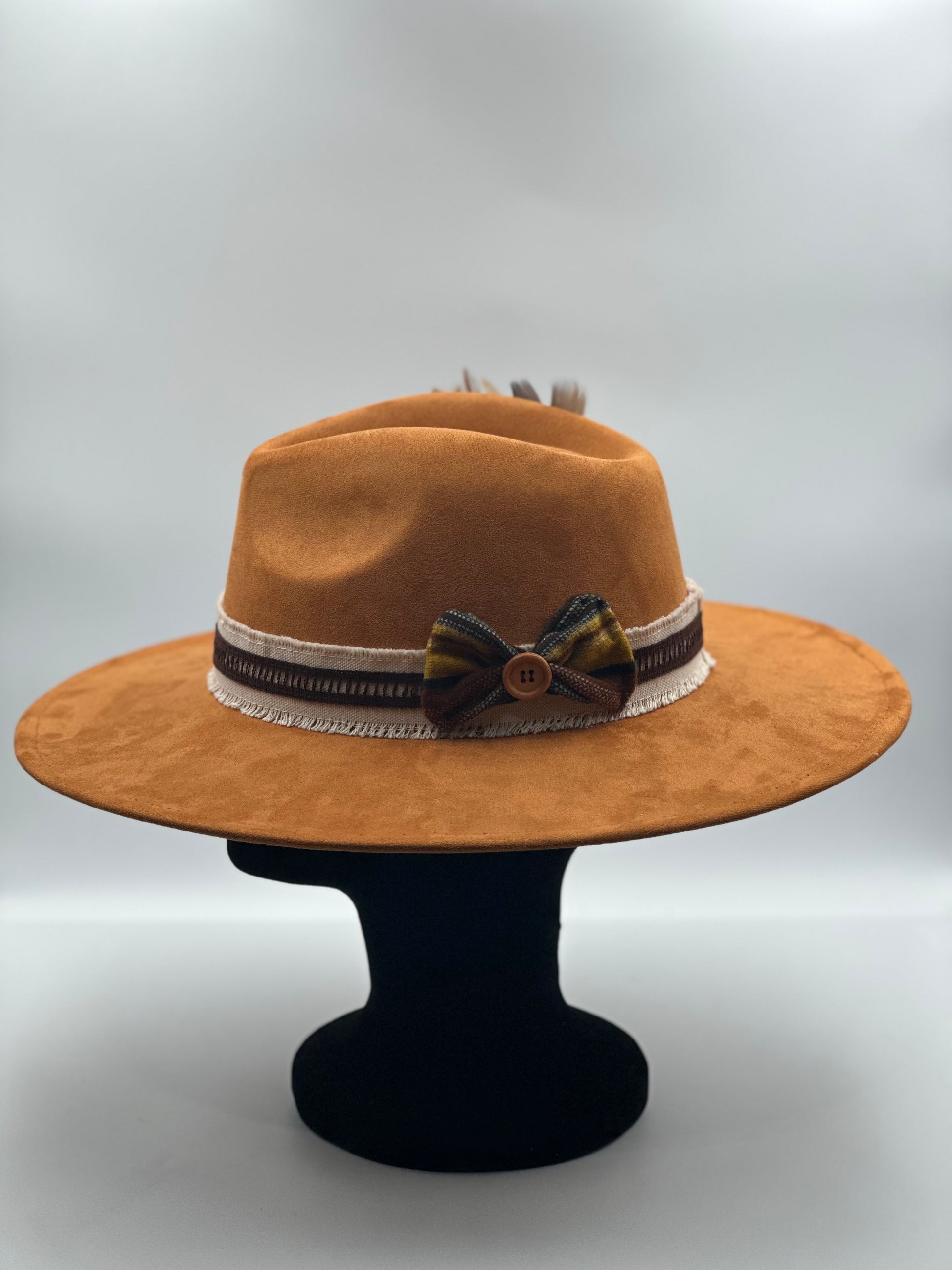 Details: A plaid bowtie adornment and hand-selected feather arrangement — symbols of individuality and timeless grace.