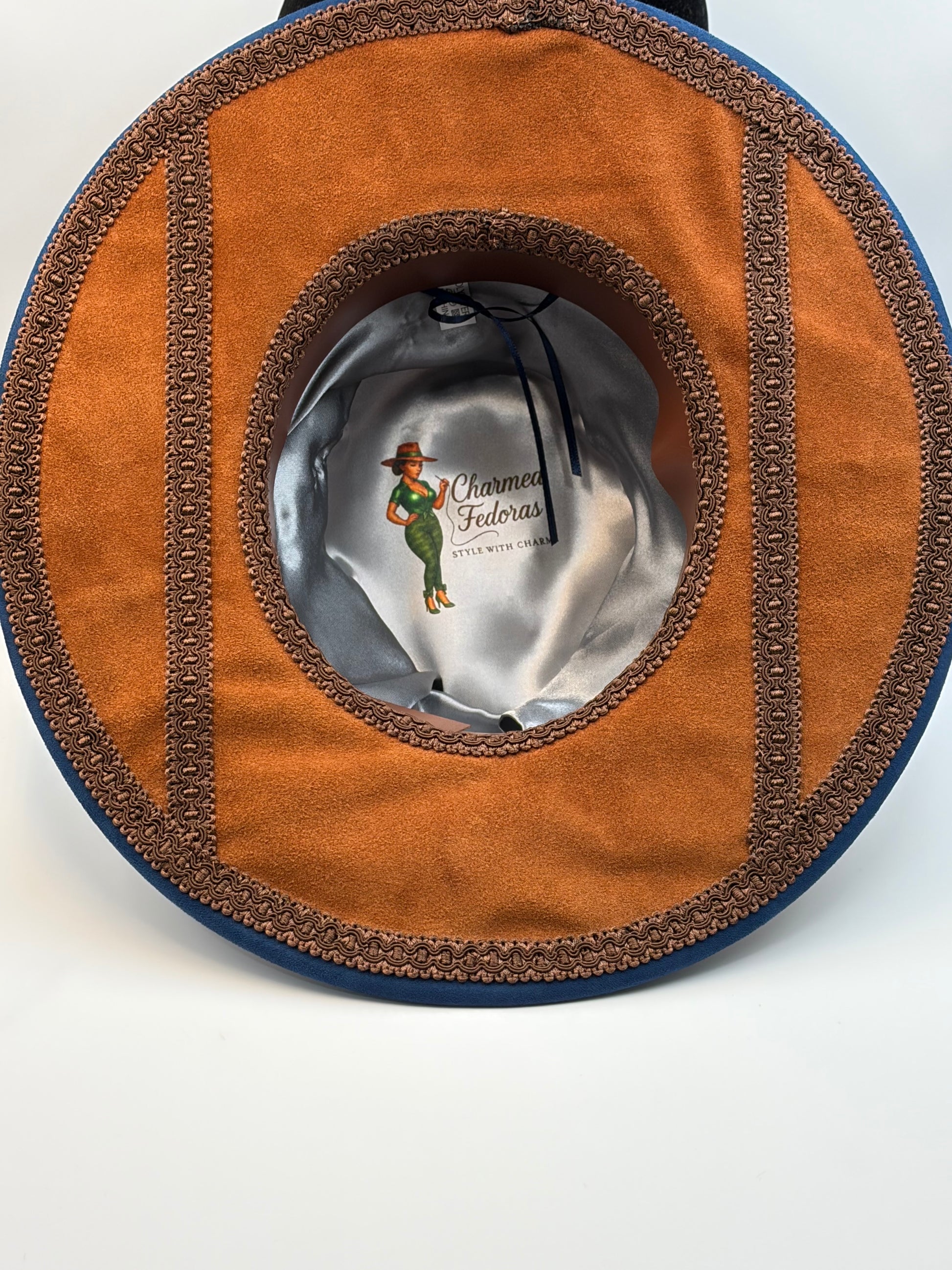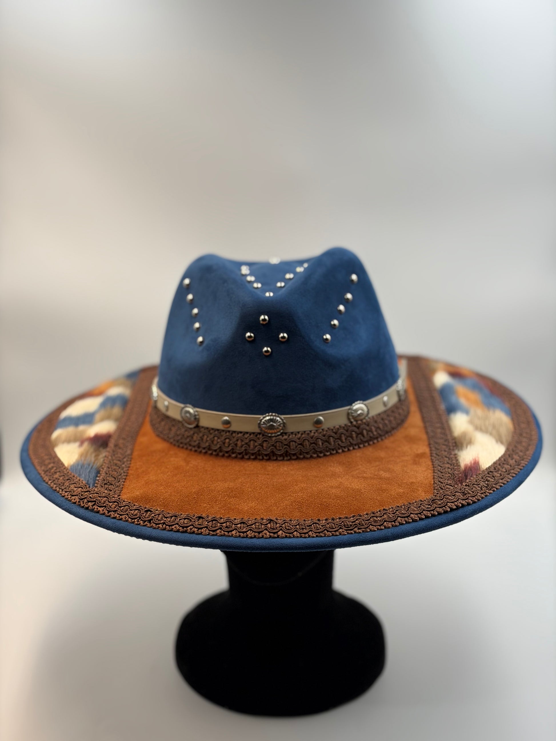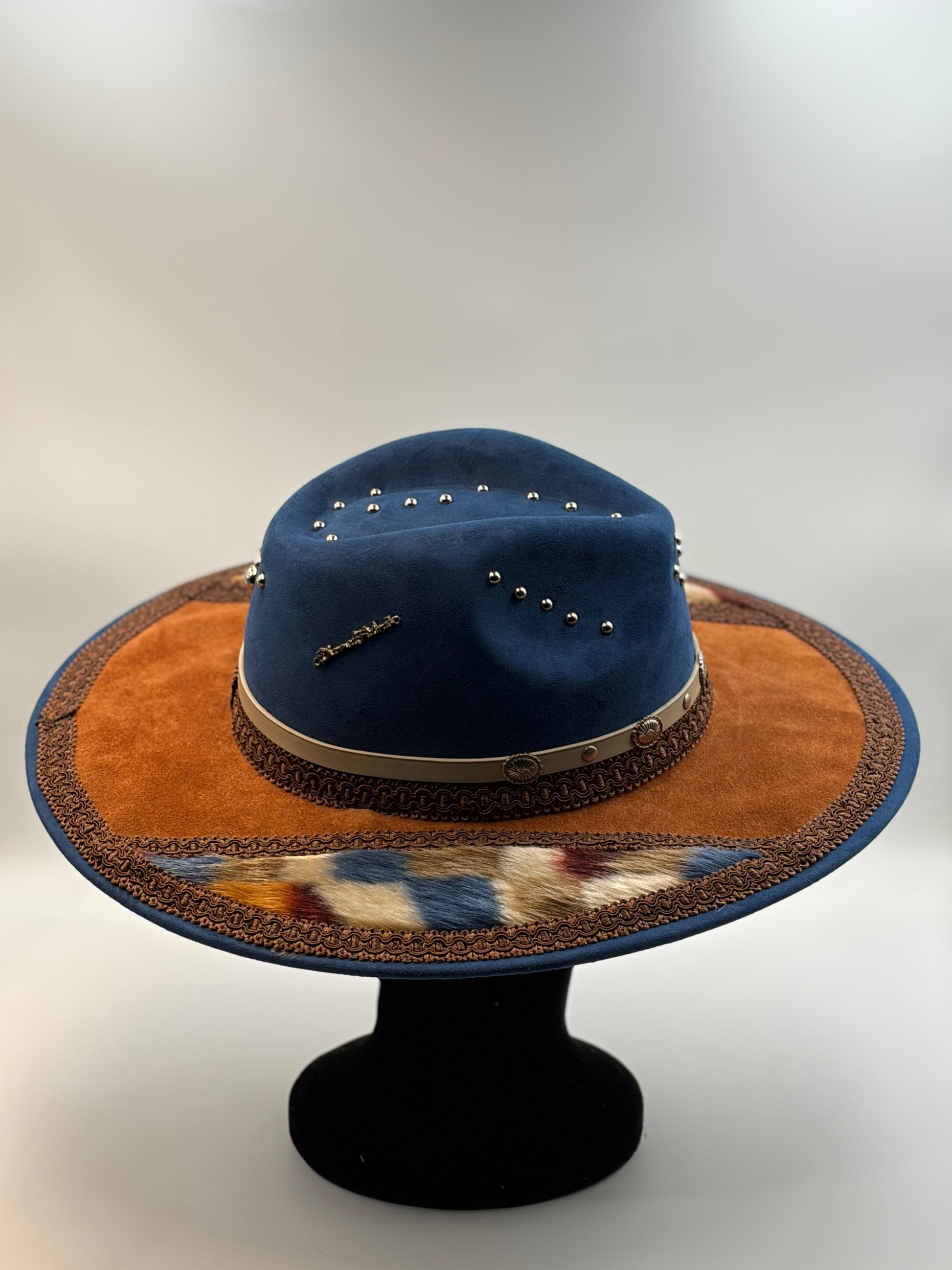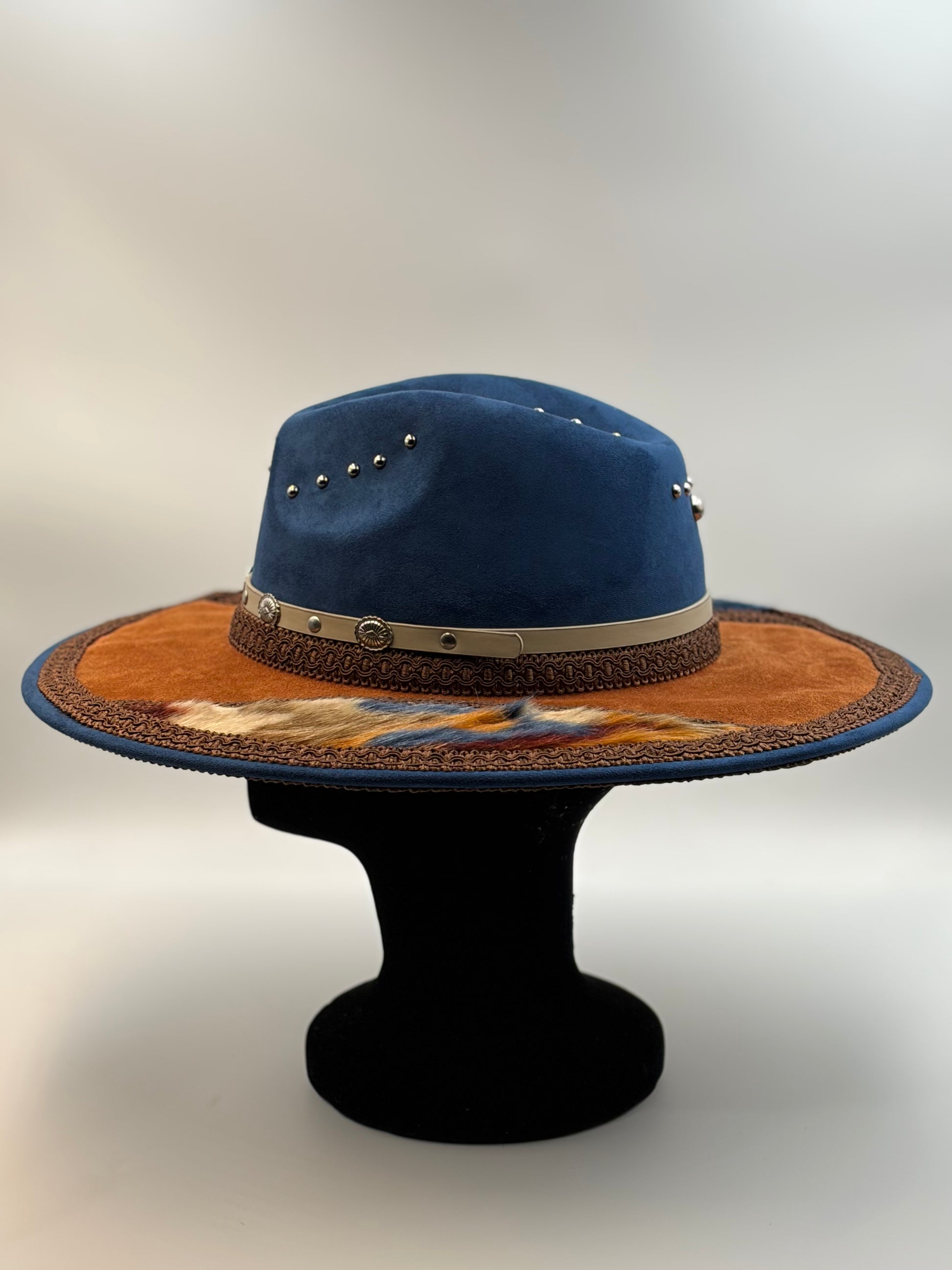 Wide brown suede brim and fur with artisan trim